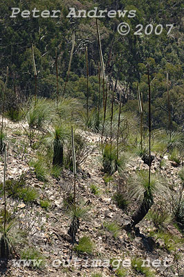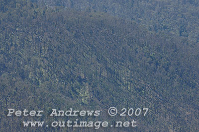 The heavily burnt out Blue Gum Forest after the November 2006 bushfire. Close examination of this and other shots at maximum resolution reveal most of the trees have regenerated growth for the length of their trunks.
