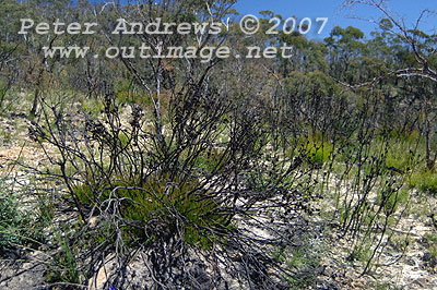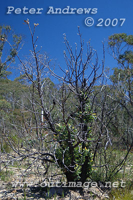 A fire damaged Banksia recovering from the November 2006 bushfire.